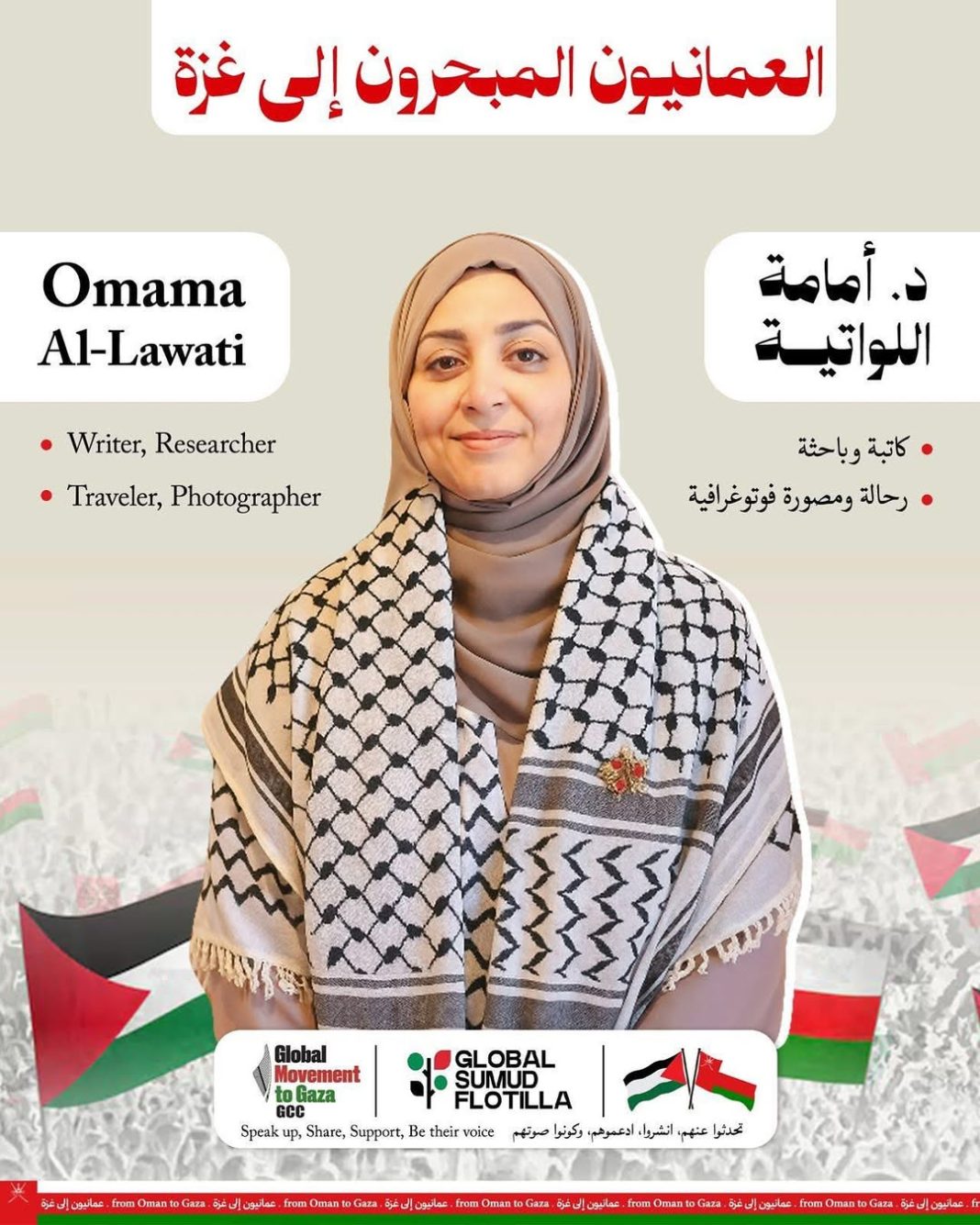 أمامة اللواتية، الأكاديمية والإعلامية العُمانية، والباحثة في مجالات الصحافة والاتصال والحوار بين الأديان، لم تتوانَ عن الانضمام إلى **أسطول الصمود العالمي** المتجه إلى غزة، إيمانًا منها بأن الوقوف إلى جانب الشعب الفلسطيني ليس خيارًا، بل واجب أخلاقي وإنساني.