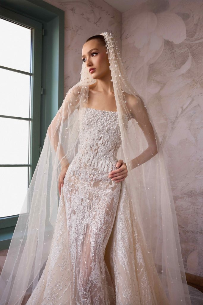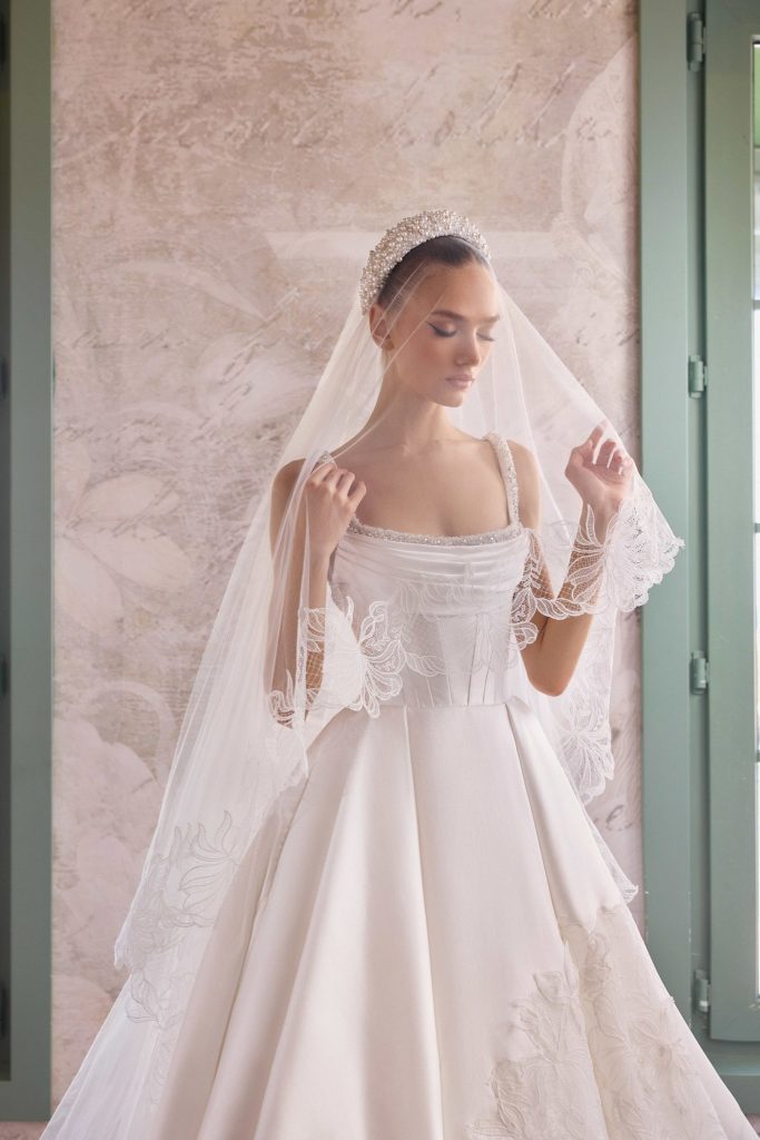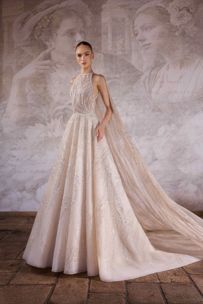 تميزت المجموعة بتصاميمٍ راقية تجمع بين الرقة والأنوثة، حيث تتقدّم الدانتيلات الزهرية بخفر، وتتلألأ اللآلئ بلطف، وتنساب الخطوط بانسيابيةٍ على الجسد. تنوّعت القصّات بين خصرٍ منخفضٍ يطيل القامة، وآخر من طراز “باسك” ينحتها برقةٍ متناهية.